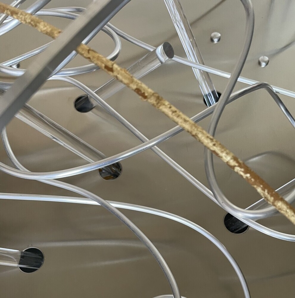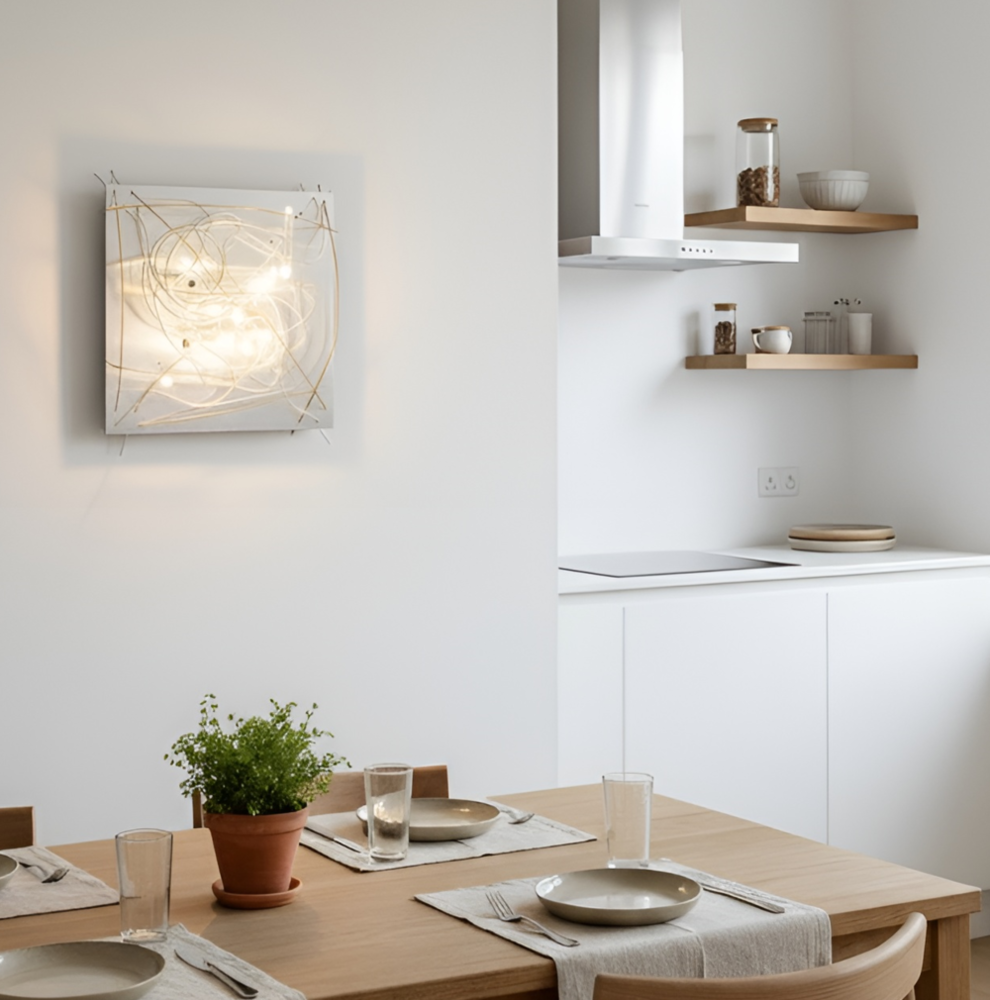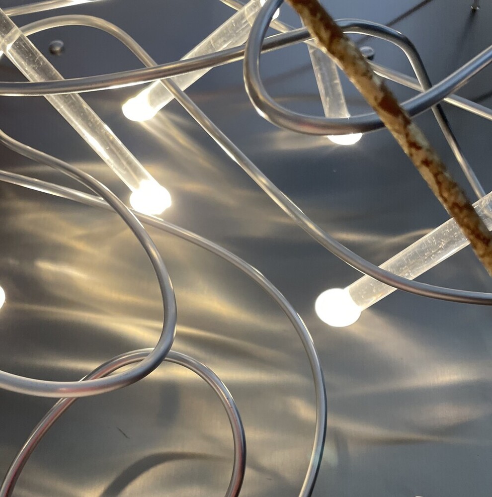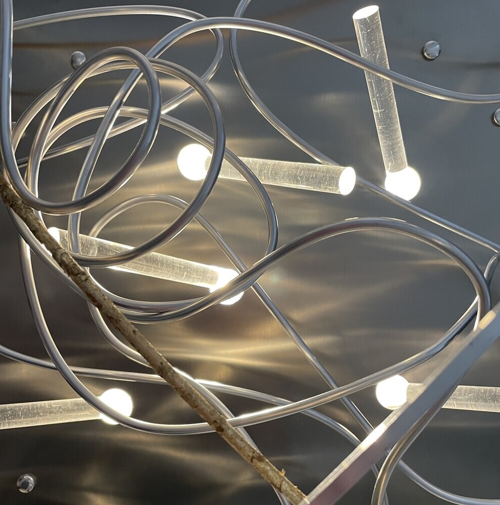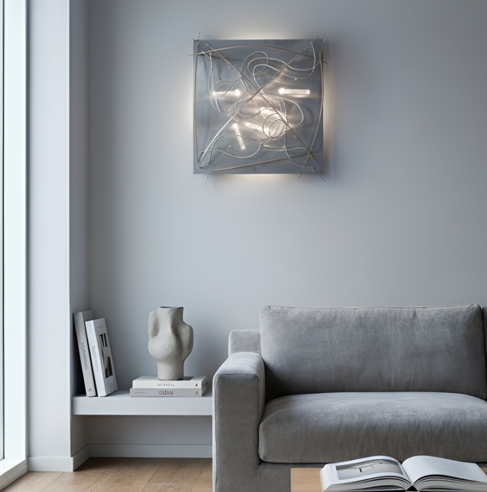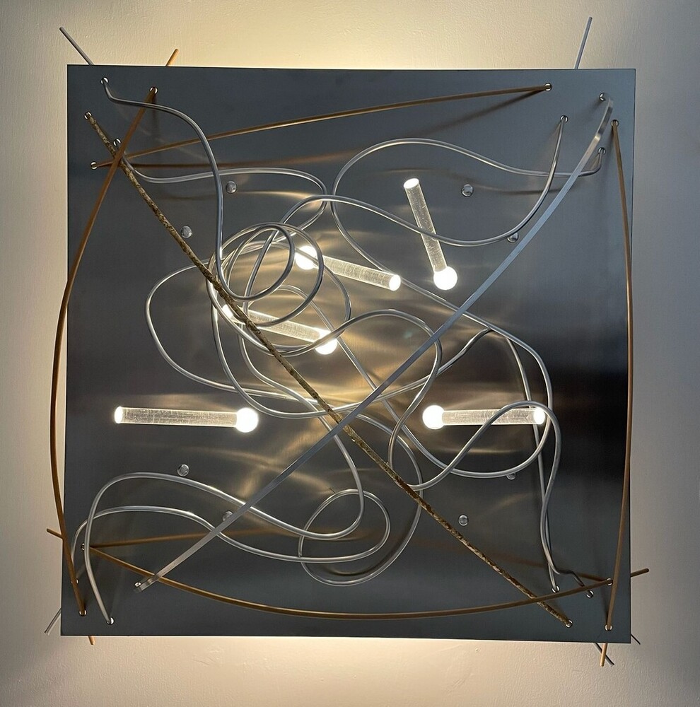 La scultura luminosa è un prodotto interamente Made in Italy, realizzata in Alluminio (struttura e lamiere decorative) che è noto per essere un materiale riciclabile al 100%. Frontalmente è stata utilizzata una lastra di ACCIAIO inossidabile tagliata al laser, con inserti in legno, alluminio e tubi di plexiglas pieno.