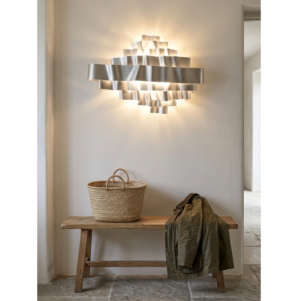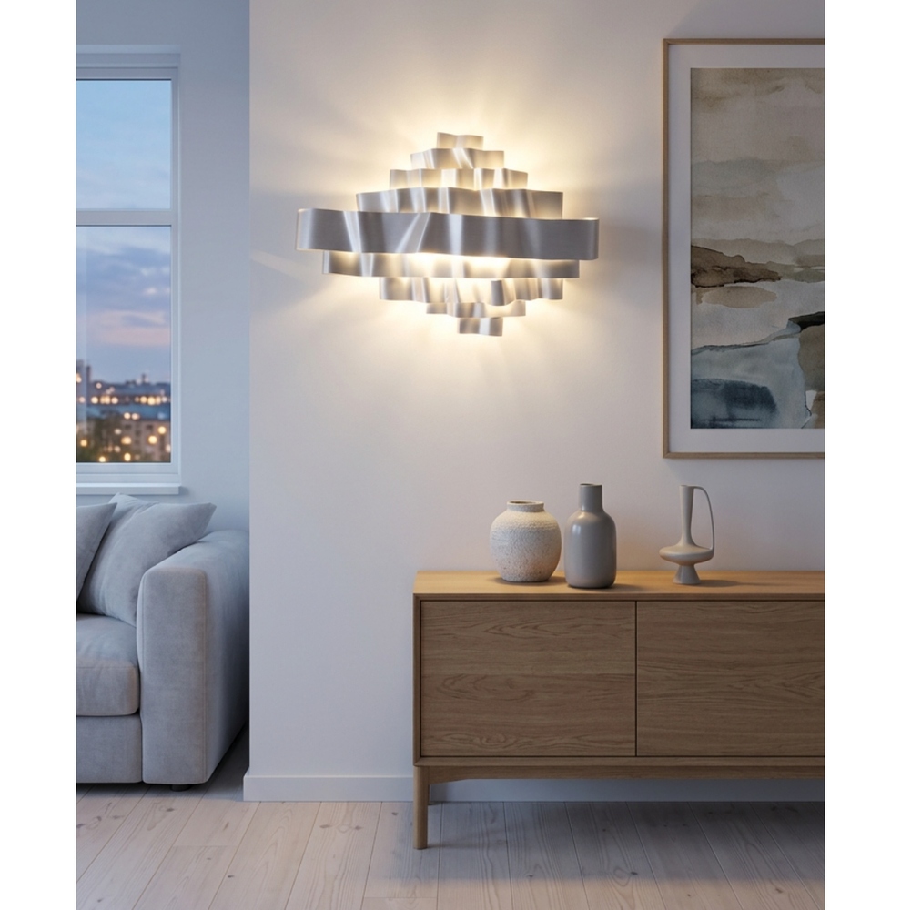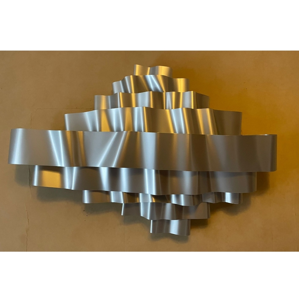 La scultura è totalmente in alluminio crudo anodizzato e misura circa 120 cm di larghezza e 80 cm in altezza.