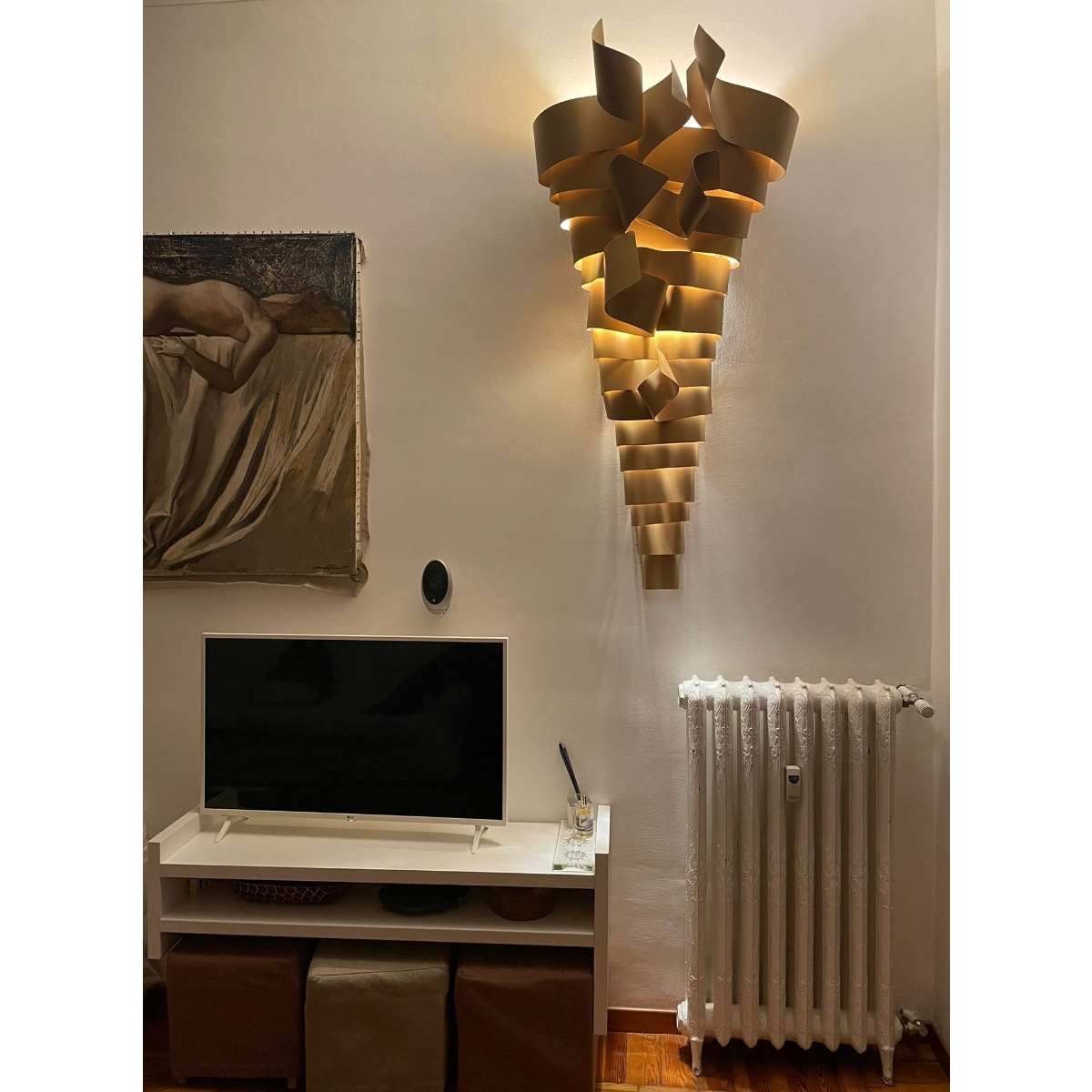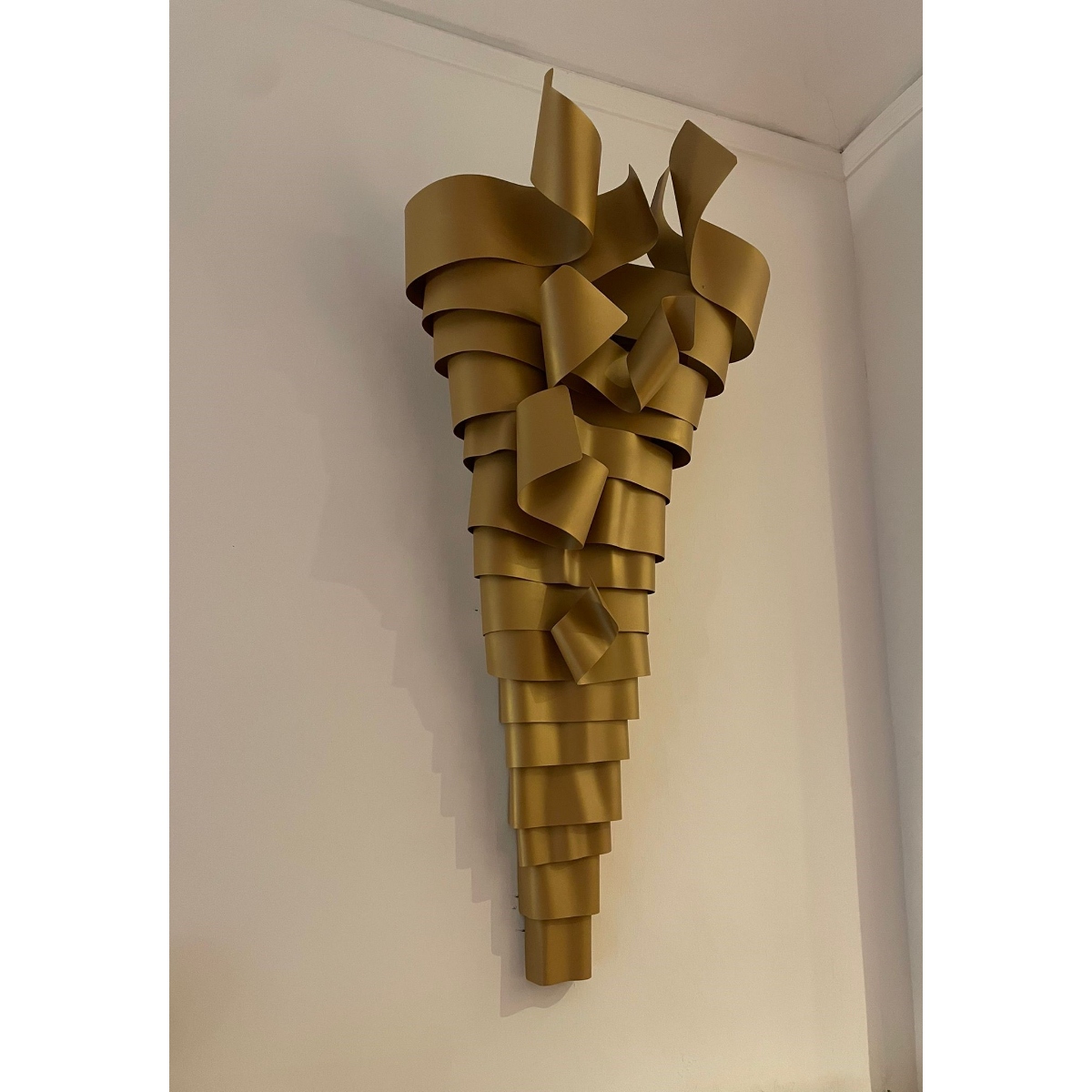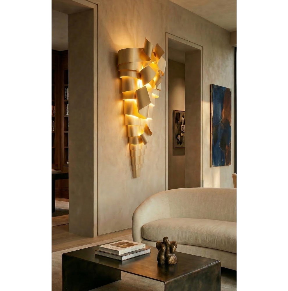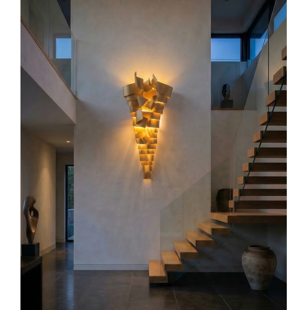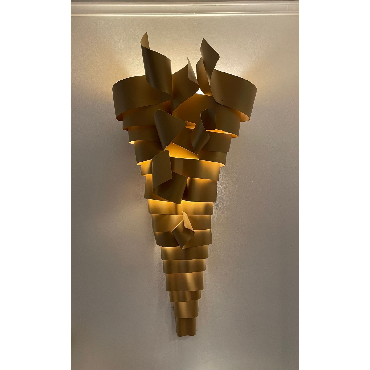 La scultura luminosa RAMPICANTE BIG ORO è un prodotto interamente Made in Italy, completamente in ALLUMINIO (struttura e lamiere decorative) che è noto per essere un materiale riciclabile al 100%. La scultura è stata colorata professionalmente con vernici atossiche a polvere, con finitura oro semilucido brillante, leggermente ruvido.