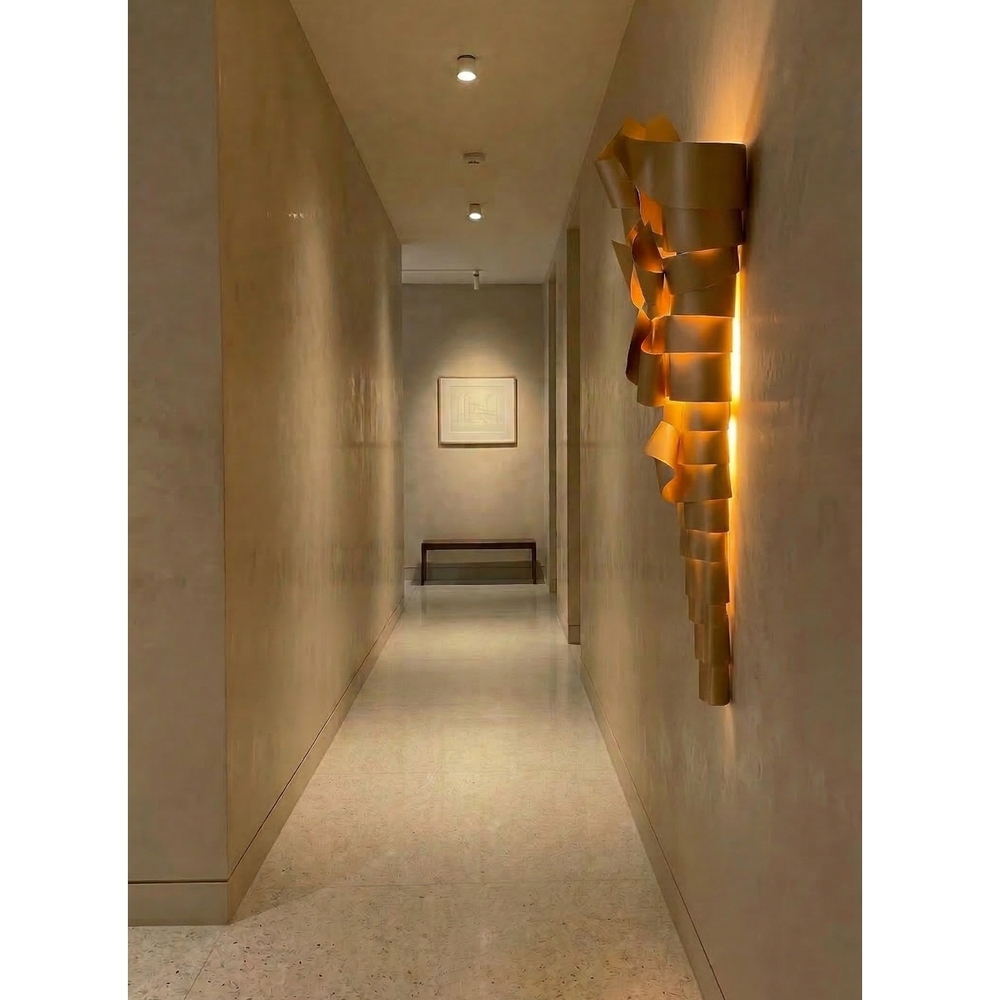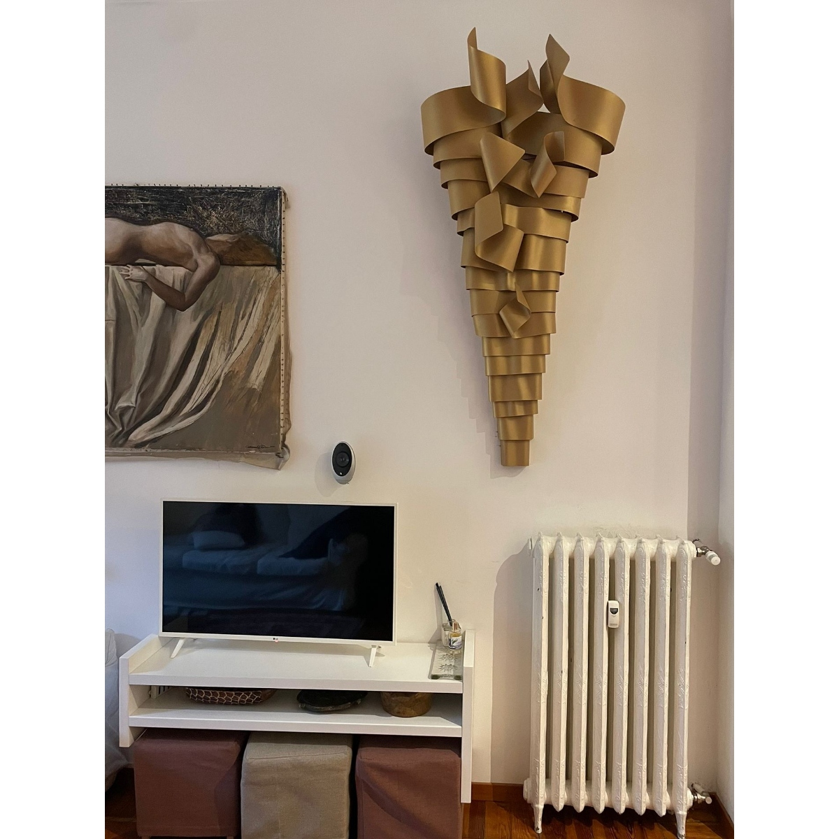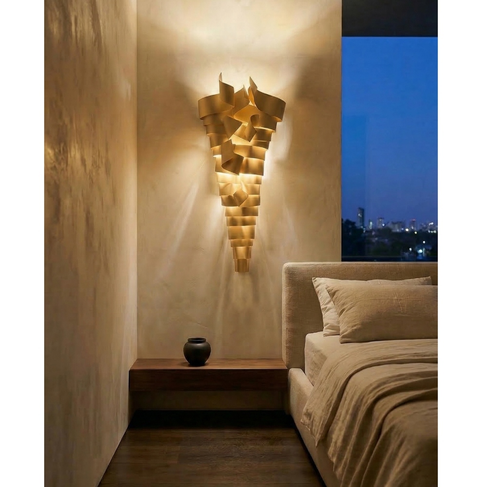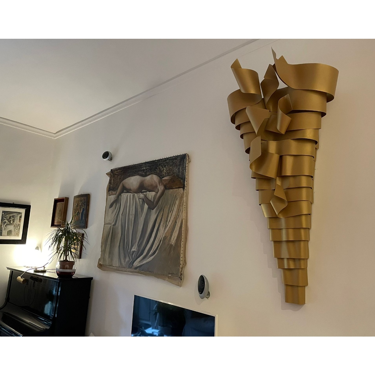 La scultura luminosa RAMPICANTE BIG ORO è un prodotto interamente Made in Italy, completamente in ALLUMINIO (struttura e lamiere decorative) che è noto per essere un materiale riciclabile al 100%. La scultura è stata colorata professionalmente con vernici atossiche a polvere, con finitura oro semilucido brillante, leggermente ruvido.
